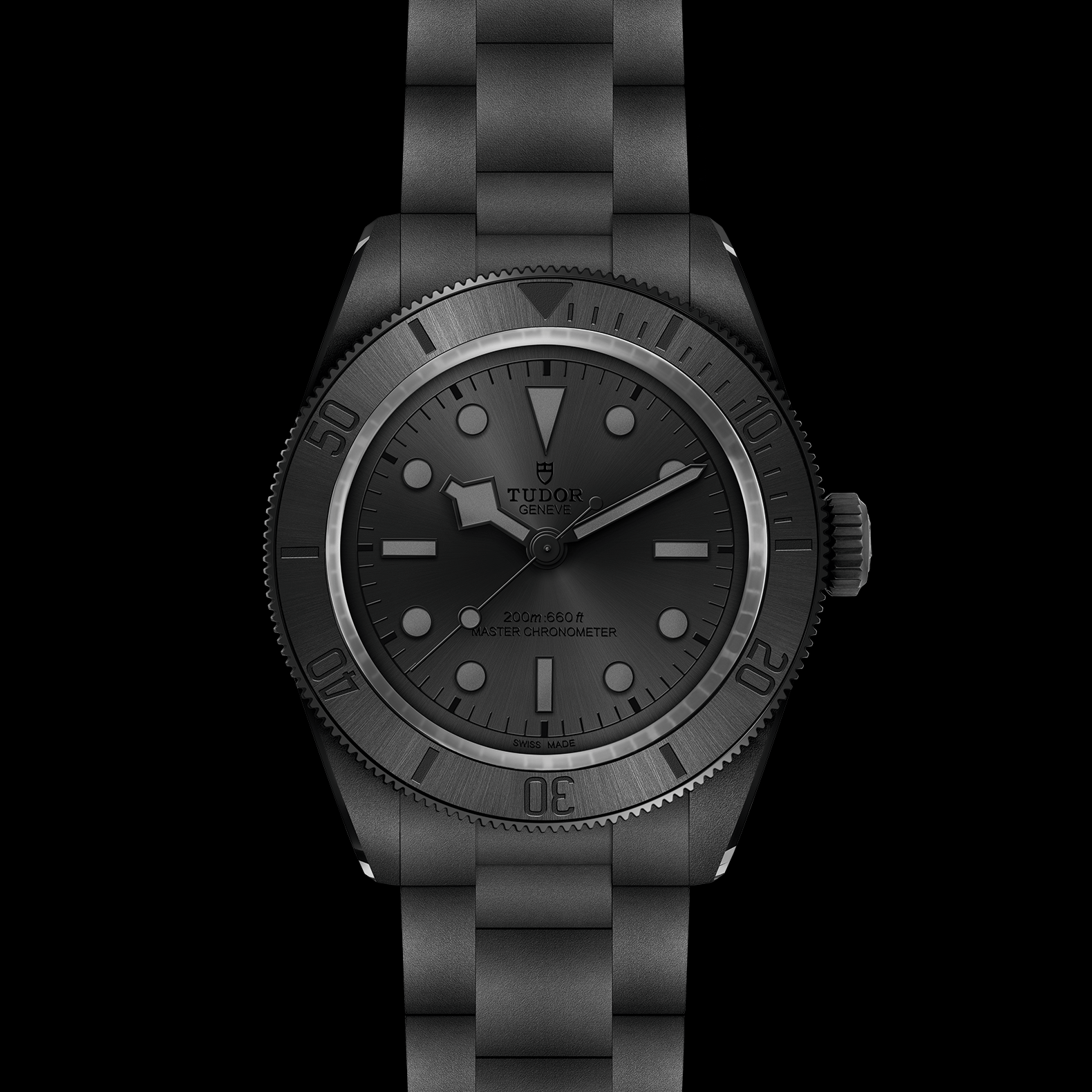 Unidirectional rotatable bezel in black-PVD-treated steel with 60-minute graduated disc in black ceramic with sunray satin finish and engraved markings and numerals